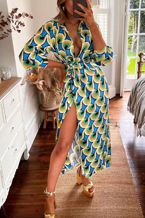 Nonnadress Fashion Printed High Waist V Neck Lace Up Split Dress
